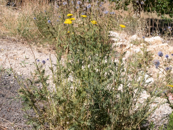 • Inflorescence & flowers: Broad, flat-topped corymbs composed of numerous small capitula; involucre campanulate, bracts scarious-margined; ligules bright yellow, conspicuous, giving the inflorescence a dense golden look.
