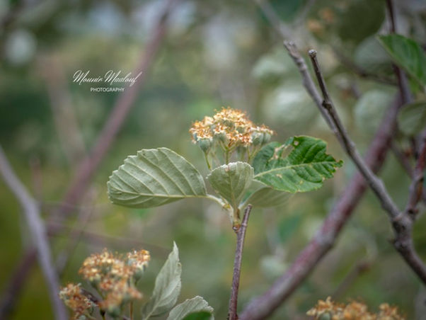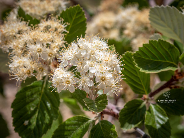 Inflorescence & flowers: Ramified corymbs with long, reddish peduncles and pedicels under a detachable white tomentum. Calyx tomentose, with lobes shorter than the obconical tube. Petals white. Numerous stamens with reddish filaments.