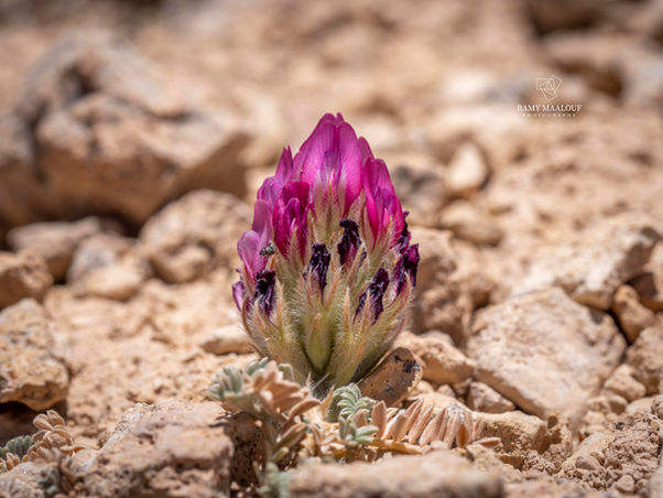 • Inflorescence & flowers: Peduncles short, shorter than the leaf and especially the capitulum, few or even solitary, borne at the branch apex. Capitula ovoid-globose, dense, many-flowered. Bracts lanceolate, 5–9 mm. Calyx 12–14 mm, densely covered with long spreading hairs; teeth about equalling the tube. Corolla slightly exceeding the calyx, pink.