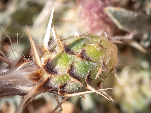 • Inflorescence & flowers: Capitulum solitary, sessile, as large or larger than the rosette. Involucral bracts arachnoid-canescent, ending in a strong semilunar dark appendage, acuminate into a spine (≥10 mm). Receptacle with smooth hairs twisted at the base. Florets purplish.